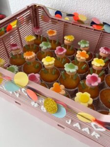 Peuter: een super simpele traktatie, maar wel mega leuk en vrolijk. Wat heb je nodig: cupcakes, dextrose lolly’s, groene dynanietstaafjes (bijv. van LookoLook) en bloemsnoepjes (bijv. van Kaja).