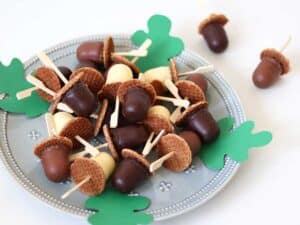 Kleuter: Is je kind in de herfst jarig, dan zijn deze eikeltjes van mini chocozoenen en kleine stroopwafeltjes een leuk traktatie idee. Je rijgt ze aan elkaar met een cocktailprikker en presenteert ze op een bord met wat eikenbladen van papier. Daar vind je hier de gratis printable van.