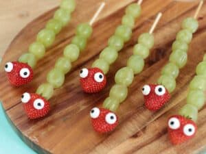 Kleuter: Een gezonde traktatie met Rupsje Nooitgenoeg thema is natuurlijk een schot in de roos bij jonge kinderen. Je maakt ze door druiven en een aardbei aan een spies te rijgen. En op de aardbei plak je twee eetbare oogjes met glazuur.