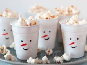 Kleuter: Popcorn is altijd een goed idee en vooral heel makkelijk als je weinig tijd of zin hebt. Kijk deze sneeuwpop beker gevuld met lekkers, leuk toch? Een kwestie van een gezichtje tekenen op een beker en daar de popcorn in stoppen.